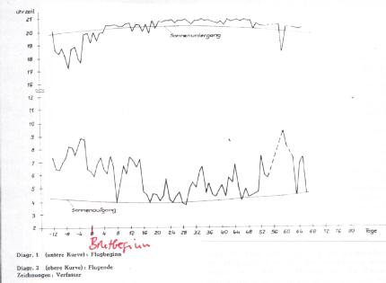 1. Einleitung Der Mauersegler ist ein ausgesprochenes Lufttier, das einen großen Teil seines Lebens im freien Luftraum verbringt und unter bestimmten Umständen sogar fliegend übernachtet. Diese bereits frühzeitig vermutete Tatsache blieb lange Zeit umstritten, bis es Weitnauer durch Einsatz moderner Hilfsmittel gelang, eindeutige Beweise für den nächtlichen Flug zu erbringen. Nach Weitnauer werden derartige Übernachtungen von einjährigen Nichtbrütern unter bestimmten meteorologischen Bedingungen ausgeführt, während die Brutvögel die Nacht gewöhnlich in ihren Nisthöhlen verbringen. . Ziel der durchgeführten Untersuchungen war es, die von Weitnauer für die Schweiz ermittelte Nichtbeteiligung der Brutvögel an den Nachtflügen durch ununterbrochene Beobachtung eines Nistkastens zu bestätigen und darüber hinaus Aussagen über die Aktivität des Mauerseglers am Nest zu gewinnen. 2. Beobachtungsmethode Eine lückenlose Aktivitätsmessung ist über längere Zeiträume nur mit automatisch arbeitenden Geräten möglich. Da die mittels Lichtschranke oder Trittkontakten arbeitenden Verfahren auf Grund möglicher Kontaktschwierigkeiten u. a. m. keine eindeutige Aussage über die nächtliche Anwesenheit beider Altvögel zulassen, wurde das Gewicht des Nistkastens registriert. Als Meßmethode wurde ein kraftkompensierendes Verfahren gewählt. Dieses Verfahren gestattet maximale Genauigkeit und Empfindlichkeit bei praktisch beliebig großen Auslenkungen auf dem Registrierstreifen. In der Abbildung ist der prinzipielle Aufbau der Meß- und Registriereinrichtung dargestellt. Der Nistkasten (1) belastet die eine Seite des zweiarmigen Waagebalkens (2), der durch die Zugfeder (3) im Gleichgewicht gehalten wird. Im Ruhezustand sind die Kontakte (4) und (5) beide geöffnet und der Motor (6) ist spannungslos. Fliegt nun ein Mauersegler in den Nistkasten, wird das Gleichgewicht gestört und der obere Kontakt (4) geschlossen. Der Motor erhält eine Spannung und bewegt das untere Federende zusammen mit dem Schreibstift (7) so lange nach unten, bis die infolge zunehmender Dehnung anwachsende Federkraft ausreicht, den Kontakt (4) wieder zu öffnen. Der Nistkasten wird beim Meßvorgang lediglich um den wenige Millimeter betragenden Kontaktabstand bewegt, während der Registrierstift ein vom Gewicht des Mauerseglers und der Dimensionierung der Zugfeder abhängige Auslenkung erfährt. Wird der Nistkasten wieder verlassen, schließt Kontakt (5), und der gleiche Vorgang läuft mit umgekehrtem Vorzeichen ab, bis der Schreibstift seine Ausgangsstellung wieder erreicht hat. Zur Registrierung des Zeitpunktes des Ein- und Ausfliegens dient eine Schreibtrommel (8), die sich innerhalb von zwölf Stunden einmal um ihre Achse dreht. Diese prinzipiell für alle Höhlenbrüter anwendbare Methode gestattet nicht nur die genaue Messung der Anwesenheit beider Altvögel, sondern auch eine überschlägige Gewichtskontrolle der heranwachsenden Jungen. Auch der Zeitpunkt des Ausfliegens der Jungvögel kann ermittelt werden. Die erreichbare Genauigkeit der Gewichts- und Zeitmessung hängt vom Aufbau der Anlage und der infolge von Windeinflüssen erforderlichen Unempfindlichkeit ab. Im vorliegenden Fall betrug sie etwa ± 5 pond und ± 5 Minuten. Die relativ ungenaue Zeitmessung ist auf vorhandene Getriebelose sowie auf Einlege- und Ableseungenauigkeiten des Schreibstreifens zurückzuführen. 3. Ergebnisse Die Aktivitätsmessungen wurden in den Jahren 1972 bis 1975 durchgeführt. Die erzielten Ergebnisse sind den Diagrammen 1 bis 5 zu entnehmen, von denen die Diagramme 1 bis 3 zur Verringerung des Wettereinflusses jeweils die Mittelwerte (Ensemblemittel) der Jahre 1973, 1974 und 1975 enthalten. 1972 begann die Brutperiode etwa 18 Tage später, so daß ein Einbeziehen der Meßwerte in die Mittelwertberechnung nicht möglich war. Auf der Abszisse sind die Kalendertage dargestellt. Bezugspunkt (Tag Null) ist der Brutbeginn. 3.1. Morgendlicher Flugbeginn Als Flugbeginn wurde der Zeitpunkt definiert, an dem der erste Altvogel den Nistkasten das erste Mal verläßt, auch wenn es sich dabei nur um einen kurzen, manchmal nur wenige Minuten dauernden Flug handelt und danach der Kasten wieder für längere Zeit aufgesucht wird. Der berechnete Mittelwert des Flugbeginns (Diagramm 1) schwankt zwischen 3.40 Uhr und 9.15 Uhr. Die ermittelten tatsächlichen Extremwerte sind 3.15 Uhr am 19.6.1972 und 15.50 Uhr am 8.6.1973. Sie wurden bei gutem bzw. extrem schlechtem Wetter registriert. Trotz der Mittelwertbildung zeigt die Kurve im Diagramm 1 einen verhältnismäßig unruhigen Verlauf. Als Maß für die auftretenden Schwankungen wurde der Mittelwert aller Differenzbeträge zwischen dem Flugbeginnzeitpunkt benachbarter Tage berechnet. Er ergibt sich zu = 0,86 Std. 3.2. Abendliches Flugende Analog zum Flugbeginn ist das Flugende derjenige Zeitpunkt, an dem der letzte der beiden Altvögel den Nistkasten aufsucht (Diagramm 2). Die Kurve weist erheblich geringere Schwankungen auf als der Flugbeginn und hängt in starkem Maße vom Zeitpunkt des Sonnenunterganges ab. Der Mittelwert des Flugendes schwankt zwischen 17.15 Uhr und 20.54 Uhr, während als extreme Werte 16.00 Uhr am 8. 6.1973 bzw. 21.10 Uhr am 26.6.1973 und 10.6.1975 festgestellt wurden. Als Maß für die Schwankung des Kurvenverlaufes ergibt sich der Wert = 0,36 Stunden. 3.3. Nichtbedeckung des Nestes Im Diagramm 3 ist die mittlere Zeitdauer dargestellt, die das Nest nicht von den Altvögeln bedeckt war. Man erkennt deutlich den steilen Abfall der Kurve bei Brutbeginn und den augenfälligen Anstieg nach der Periode intensiven Huderns. Obwohl die Mittelwertkurve nur an wenigen Tagen den Wert Null erreicht, wurde zeitweise sehr fest gebrütet. So blieb das Nest 1974 vom 6. bis zum 18. Tag ununterbrochen bedeckt. Andererseits war am 13.6.1973 (16. Tag nach Brutbeginn) insgesamt vier Stunden und sechs Minuten keiner der Altvögel im Kasten. 3.4. Zahl der täglichen Einflüge Die Diagram