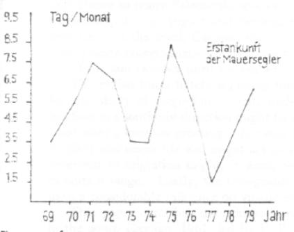 Ab 1970 beringte ich die Alt- undJungvögel,das zeigte, daß im Beobachtungszeitraum zwei Pärchenden Kasten besetzten. Das eine Pärchen(bezeichnet als Paar Nr. 1) von 1970 (oder früher) bis 1974und das andere Pärchen(bezeichnet als Paar Nr. 2) ab 1975. Die zehnjährigenBeobachtungsdaten ergeben den 4./5. Mai als durchschnittlichenAnkunftstag der ersten Mauersegler in Annaberg-Buchholz. Der durchschnittlicheAnkunftstag für das Männchenvom Paar- Nr. 1 war der 17. Mai, für das Weibchen der 24.Mai. Hier kam das Weibchen eine Woche späteran. Für das Männchenvom Paar Nr. 2 ist es der 15. Mai und für das Weibchen der17. Mai. Das Weibchen kommt hier nur zwei Tage späteran, das scheint der Normalfall zu sein. Wenn man die Ankunftsdatenbetrachtet, so kann besonders das Paar Nr. 2 zu der zurückkehrendenHauptmasse von Mauerseglern gezähltwerden. Die Männchenkehren somit im Frühjahr einige Tage früher als dieWeibchen aus ihrer Winterherberge zurück. Das Männchenvom Paar Nr. 1 kontrollierte ich 1971 bis 1974 im selben Kasten.Diese Nistplatztreue ist Voraussetzung für eine mehrjährigePartnertreue.