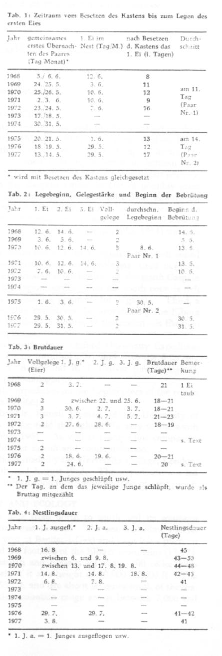 1972 wurden die Jungvögelab Anfang August nur noch von einem Alten gefüttert (da einAltvogel rechts und der andere links beringt konnte diese Tatsacheleicht festgestellt werden). 1973 kam es zu keiner Brut, das Pärchenübernachtete nur vom 17. zum 18. Mai im Kasten dann nichtmehr. Bis Anfang Juni übernachtete nur ein Altvogel, denich leider nicht kontrollierte.