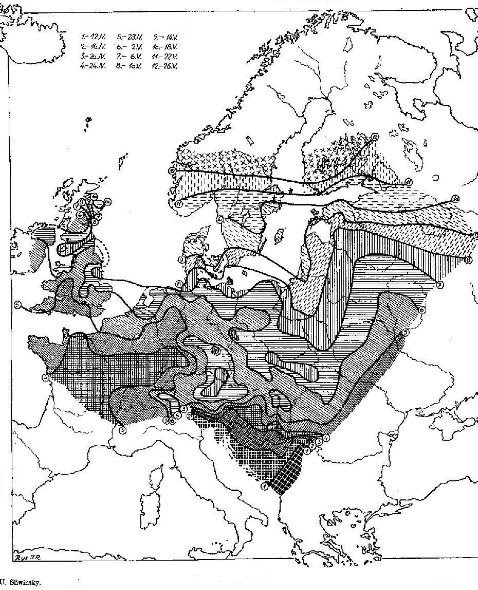 Alle phänologischen Erscheinungen, die eine gewisse Jahreszeit kennzeichnen, zeigen ähnlichen Charakter im Verlauf der isophänologischen Linien. Diese Eigenart nutzte Szafer (368) in der Phytophänologie aus; er wählte für jede Jahreszeit eine charakteristische, entsprechende, oder, wie er sie nennt, "führende" Pflanzenart aus und erläuterte auf Grund ihrer Isophänen (die die Zeit des Aufblühens darstellen) den phänologischen Charakter der angeführten Jahreszeit in den einzelnen Gebieten Polens. Beim Vergleich der Isophänen der hier behandelten Vogelarten sehen wir einen ähnlichen Verlauf der Linien von Hirundo rustica L., Delichon urbica L., Apus apus L. und Cuculus canorus L., die ungefähr zu gleicher Zeit anlangen, während die Isopiptesen von Ciconia ciconia L. ein von den übrigen vollständig abweichendes Bild darstellen. Sie könnten also nur kurze Zeitabschnitte charakterisieren. Die phänologischen Jahreszeiten für die Posener Gegend, die Szafer (368) auf Grund phytophänologischer Forschungen nach Einteilung Ihne's (179) aufstellte, fallen in folgende Termine: Vorfrühling