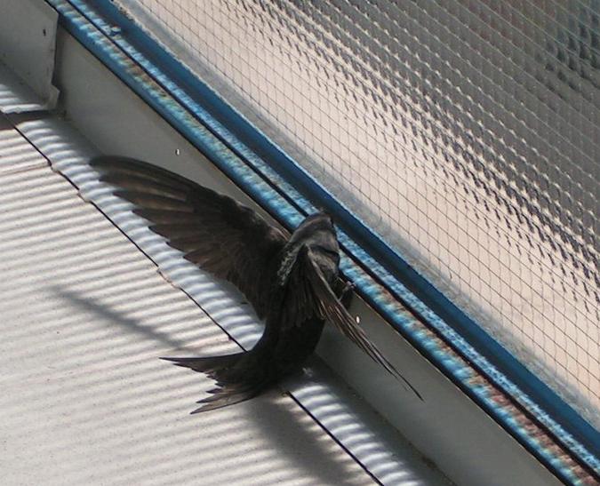 Yesterday (24th May 2009) I had an interesting encounter with a Common Swift. They perform regular flights around the house where I live in Prague. At 13 o'clock a lot of Swifts appeared near my balcony, which was quite unusual, because they do this usually in the early morning or evening. I realized that a Common Swift was regularly flying to the ceiling of my balcony. I ran for the camera and I managed to take a picture of it. However, the Swift didn't manage to leave my balcony, it stayed behind the glass shield I have there. The Swift stayed on the floor of the balcony regularly taking off but always held back by the glass. I needed to open several of the glass shields of the balcony, and then the Swift was able to escape.