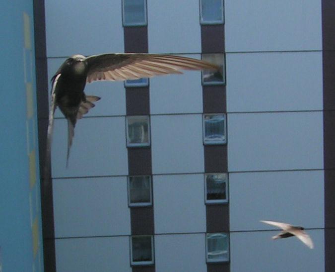 Every now and then one sees a Swift in flight adopt an unusual "hunched" shape. It has put its bill somewhere deep into its feathers. It loses height, but after a few seconds it adopts its normal flight posture again. This is the only known instance of Swift feather care in the air, though most people interpret it as an attempt to try to get rid of parasitic louse flies.