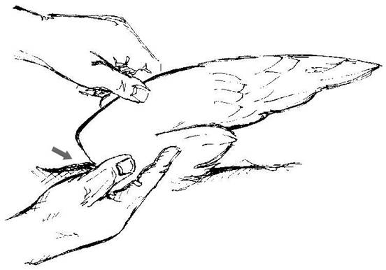 Injuries (wounds, blood, hanging wing, twisted