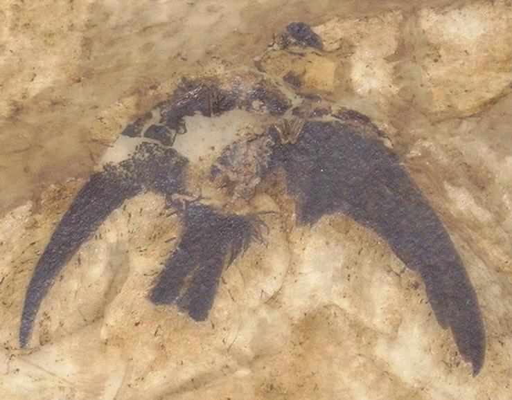 It flew and hunted insects over the shallow tropical seas and the marshland in the area that is now Hesse in Germany. It died in flight some 49 million years ago, falling into the sea, and was preserved in the oil shales of Grube Messel. This is a photograph of the remains of the oldest-known Swift.