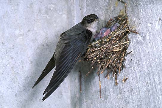 Palm Swifts are among the smaller swifts (17 cm in length) with the deepest forked tails among all swifts. Their nests are simple pads of plant floss and feathers glued to the surface of downward hanging palm fronds. Likewise the eggs are glued to the nest thus keeping them from being ejected when winds blow the palm fronds. There are two species, the African Palm Swift (photo) which occurs in subsaharan Africa from Kenya to South Africa and the Asian Palm Swift (Cypsiurus balasiensis) which occurs in southern Asia from India to the Phillipines.